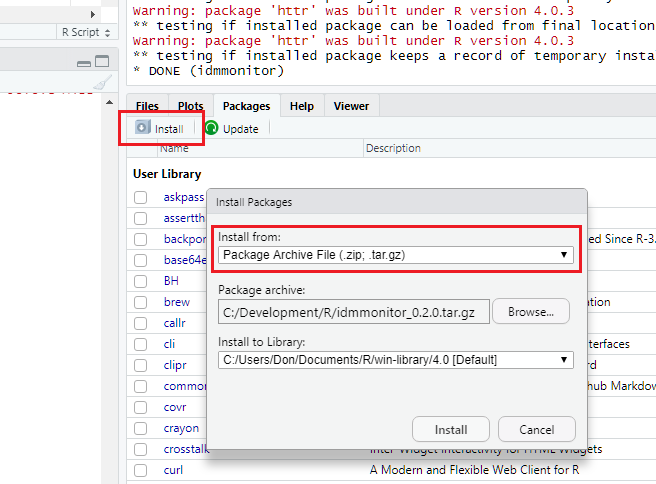 E.g: install.packages("C:\idm-r\idmmonitor-r.tar.gz", repos = NULL)